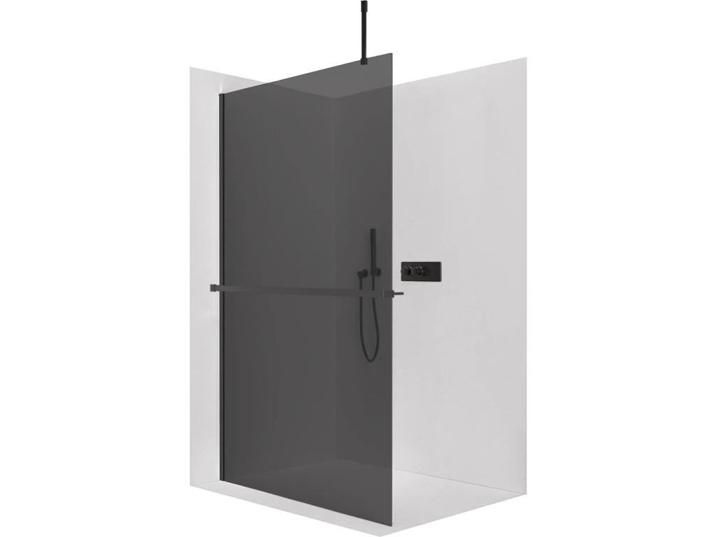 CERANO - Parawan prysznicowy typu walk-in Onyx Top Cube L/P - 10 mm - wspornik kwadratowy + półka/uchwyt na ręcznik - matowa czerń, szkło grafitowe - 110x200 cm