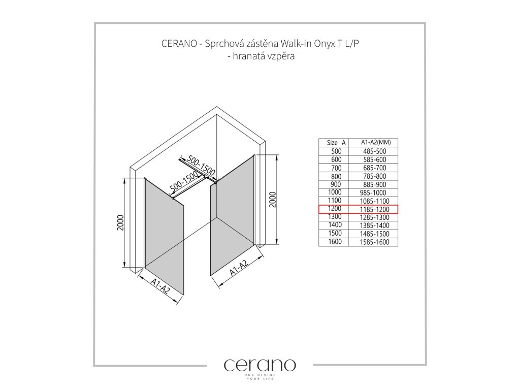 CERANO - Ścianka kabiny prysznicowej typu walk-in Onyx TL/P - 8 mm - wspornik kwadratowy - chrom, szkło industrialne - 120x120x200 cm