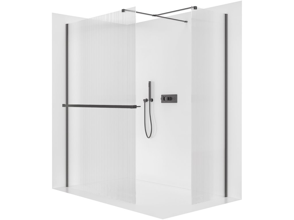 CERANO - Ścianka kabiny prysznicowej typu walk-in Onyx TL/P - 8 mm - wspornik kwadratowy + półka/uchwyt na ręcznik - matowa czerń, szkło ryflowane - 120x120x200 cm