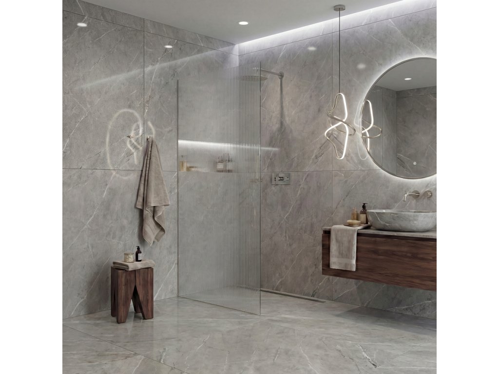 Dzięki wyrafinowanej konstrukcji szkło jest ukryte w profilach, które można całkowicie lub częściowo wpuścić w płytki lub kostkę brukową (do 14 mm). Bez przeszkadzających elementów konstrukcyjnych , powstaje czyste, eleganckie rozwiązanie , które podkreśla nowoczesny wygląd łazienki i nadaje jej maksymalną lekkość wizualną.