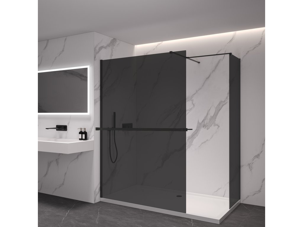 CERANO - Kabina prysznicowa typu walk-in Onyx TL/P - 8 mm - wspornik kwadratowy + półka/uchwyt na ręcznik - matowa czerń, szkło grafitowe - 160x70x200 cm