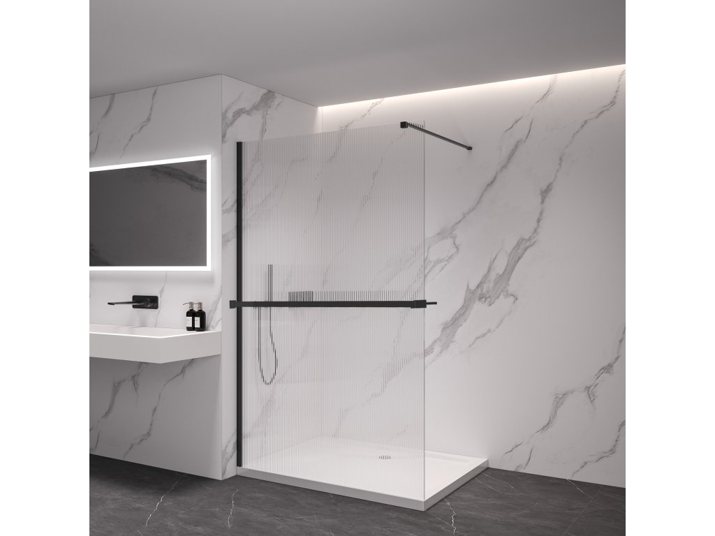 CERANO - Kabina prysznicowa typu walk-in Onyx Cube L/R - 8 mm + półka/uchwyt na ręcznik - wspornik kwadratowy - matowa czerń, szkło ryflowane - 50x200 cm