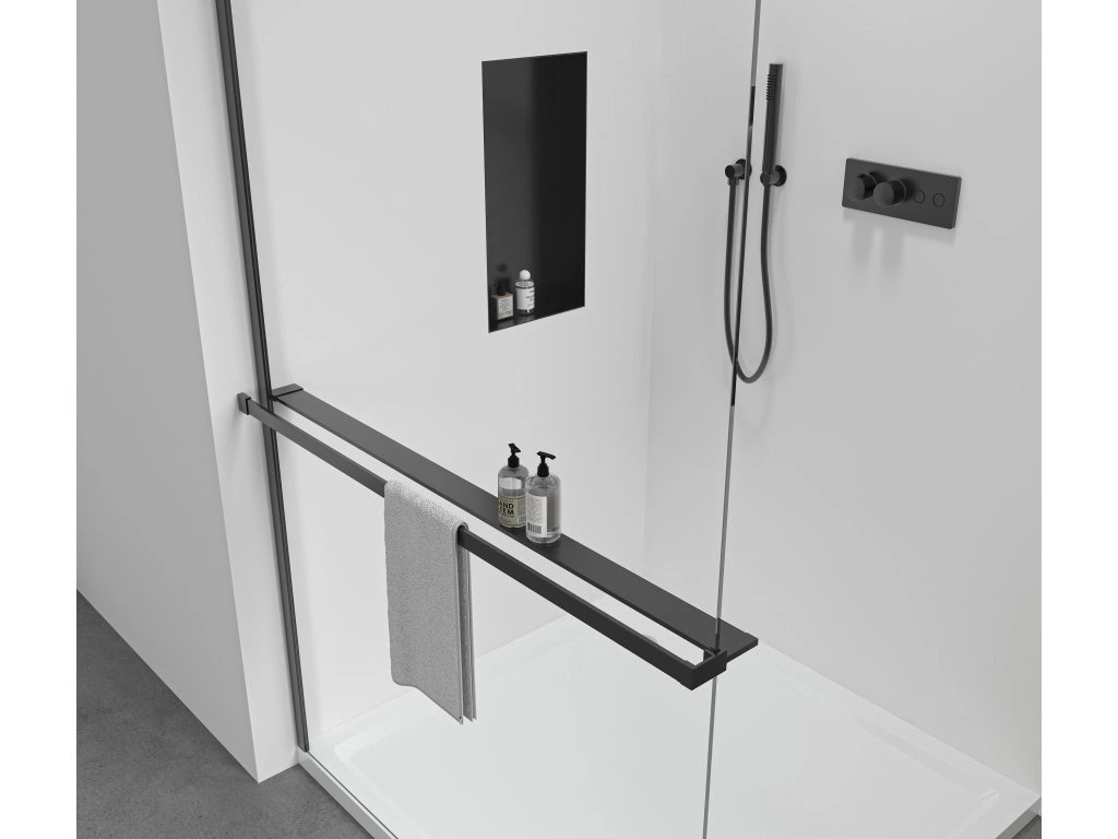 Inteligentne rozwiązanie 2 w 1 do kabin prysznicowych. Zewnętrzny uchwyt na ręczniki, praktyczna półka na kosmetyki i drobiazgi wewnątrz – wszystko pod ręką. Pasuje do kabin prysznicowych o maksymalnej grubości szkła 8 mm . Regulowana szerokość od 30 do 160 cm w zależności od rodzaju kabiny. Oszczędność miejsca, nowoczesny wygląd i praktyczne zastosowanie w jednym.