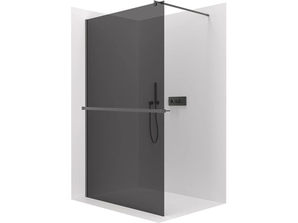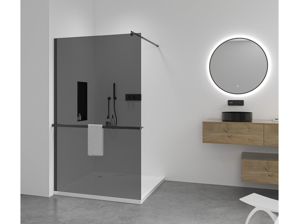 CERANO - Kabina prysznicowa typu walk-in Onyx Round L/R - 10 mm + półka/uchwyt na ręcznik - wspornik okrągły - matowa czerń, szkło grafitowe - 90x200 cm