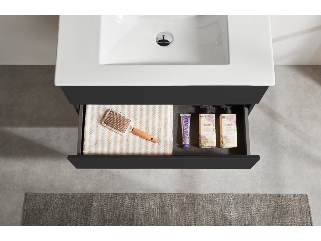 Szafka przeznaczona jest do montażu na ścianie i wyposażona w regulowane okucia, znajdujące się na korpusie szafki pod górnym fryzem, umożliwiające regulację wysokości i płaszczyzny. W szufladzie znajduje się zakryte wycięcie do montażu syfonu umywalkowego.