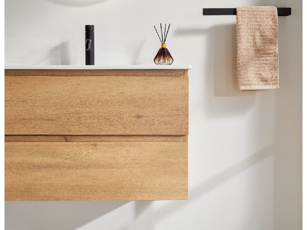 Szafki łazienkowe wykonane są z laminatu MDF (płyty pilśniowej średniej gęstości) pokrytego folią melaminową, która jest odporna na wilgoć, zarysowania, promieniowanie UV i powszechnie stosowane środki czyszczące. Powierzchnia jest gładka, twarda, jednorodna i łatwa w czyszczeniu. Płyty MDF nie odkształcają się jak lite drewno. Uszkodzenie mechaniczne laminatu może prowadzić do zawilgocenia rdzenia MDF.