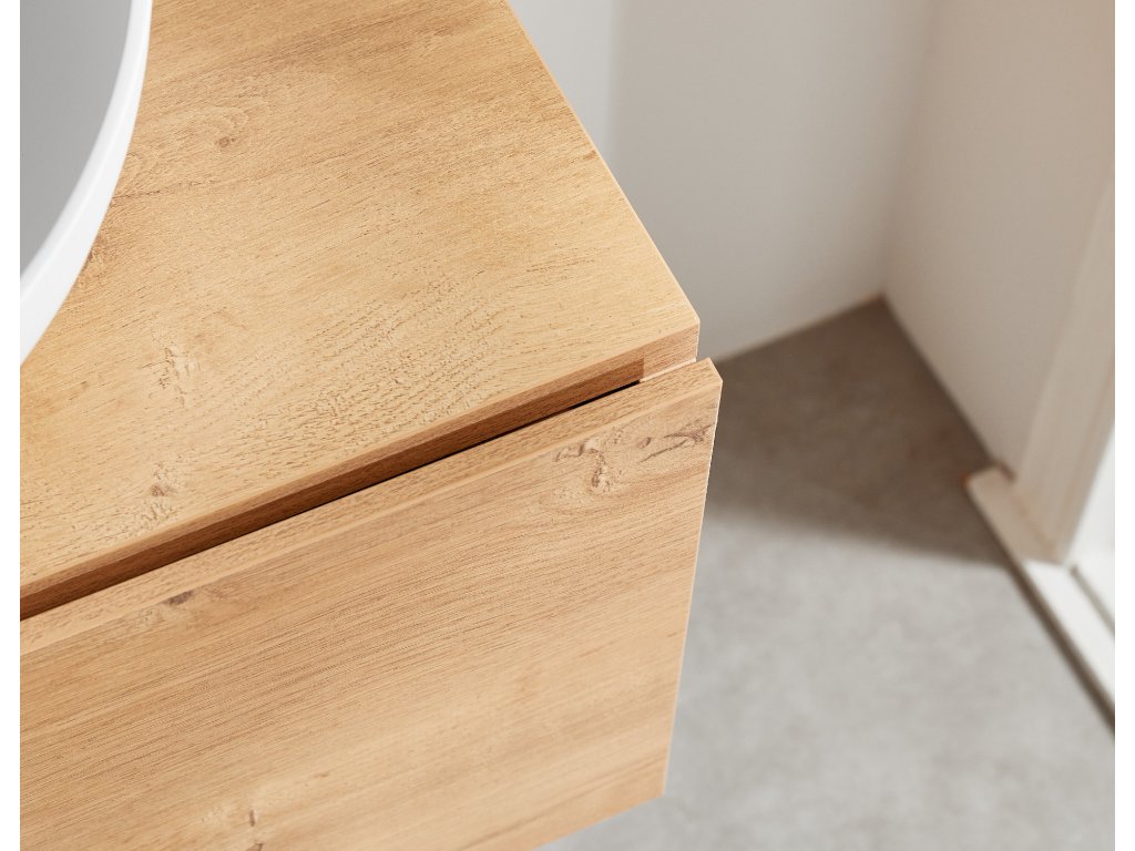 Szafki łazienkowe wykonane są z laminatu MDF (płyty pilśniowej średniej gęstości) pokrytego folią melaminową, która jest odporna na wilgoć, zarysowania, promieniowanie UV i powszechnie stosowane środki czyszczące. Powierzchnia jest gładka, twarda, jednorodna i łatwa w czyszczeniu. Płyty MDF nie odkształcają się jak lite drewno. Uszkodzenie mechaniczne laminatu może prowadzić do zawilgocenia rdzenia MDF.