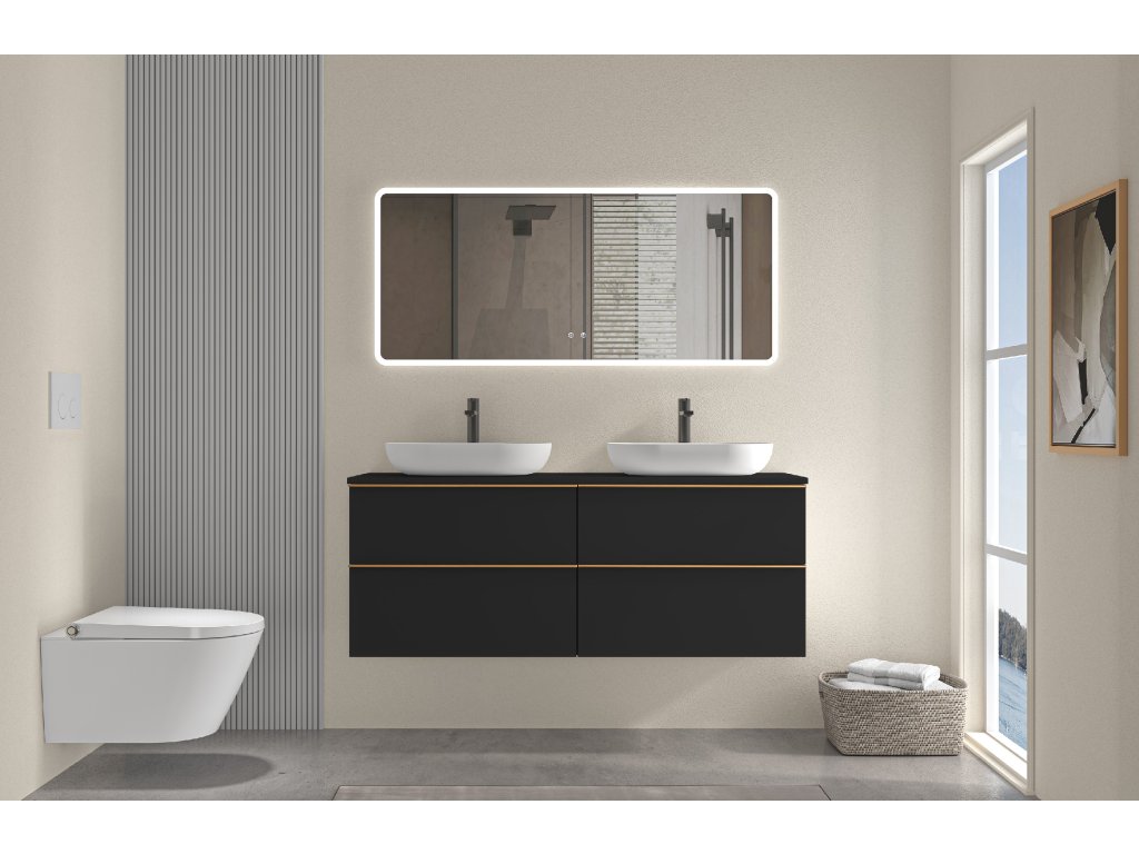 CERANO - Szafka łazienkowa pod umywalkę z uchwytem Velora - matowa czerń, uchwyt złoty - 138x53x45,2 cm
