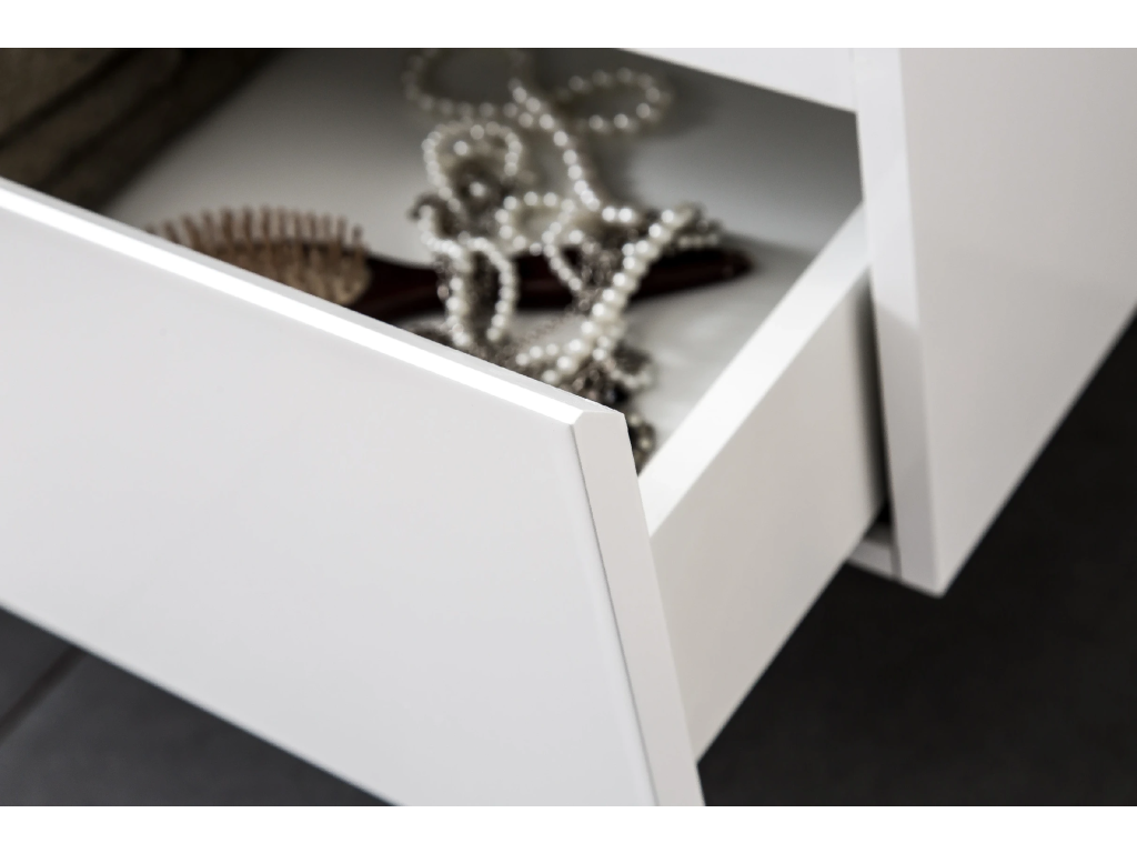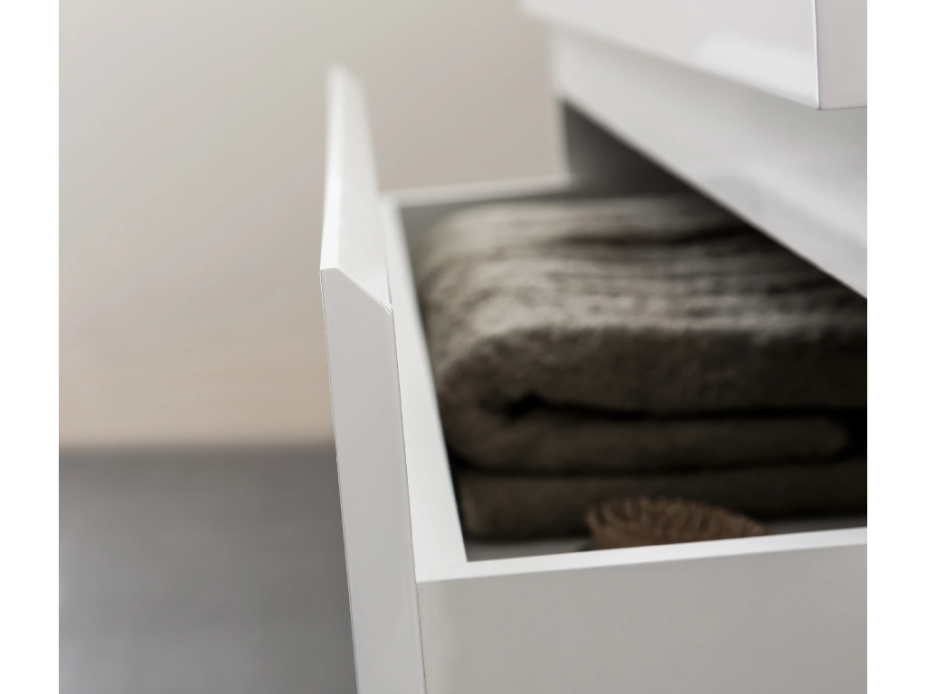 Szafka przeznaczona jest do montażu na ścianie i wyposażona w regulowane okucia, znajdujące się na korpusie szafki pod górnym fryzem, umożliwiające regulację wysokości i płaszczyzny. W szufladzie znajduje się zakryte wycięcie do montażu syfonu umywalkowego.