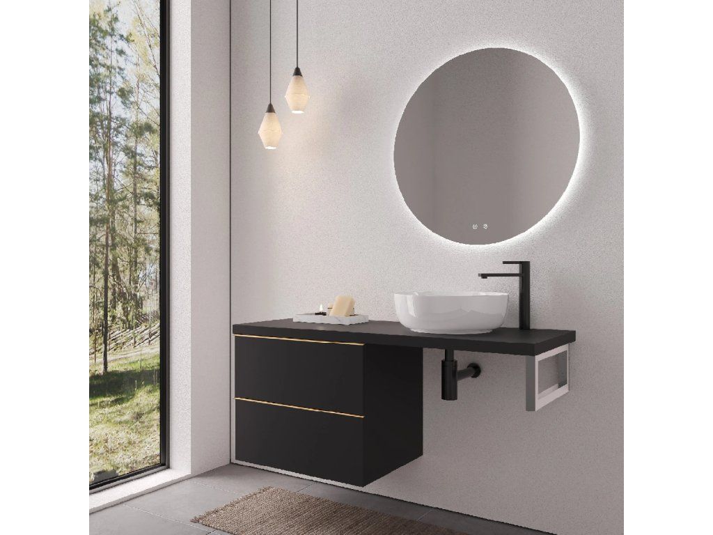 CERANO - Blat umywalkowy Navira Pro - 161x46,5x3,6 cm - Szafka Velora 79 cm - matowa czerń, złoty uchwyt - chromowana konsola