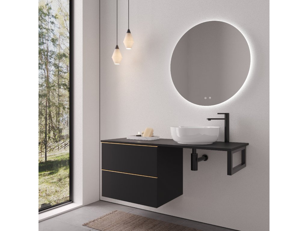 CERANO - Blat umywalkowy Navira Slim - 141x46,5x3,6 cm - Szafka Velora 69 cm - matowa czerń, złoty uchwyt - czarna konsola