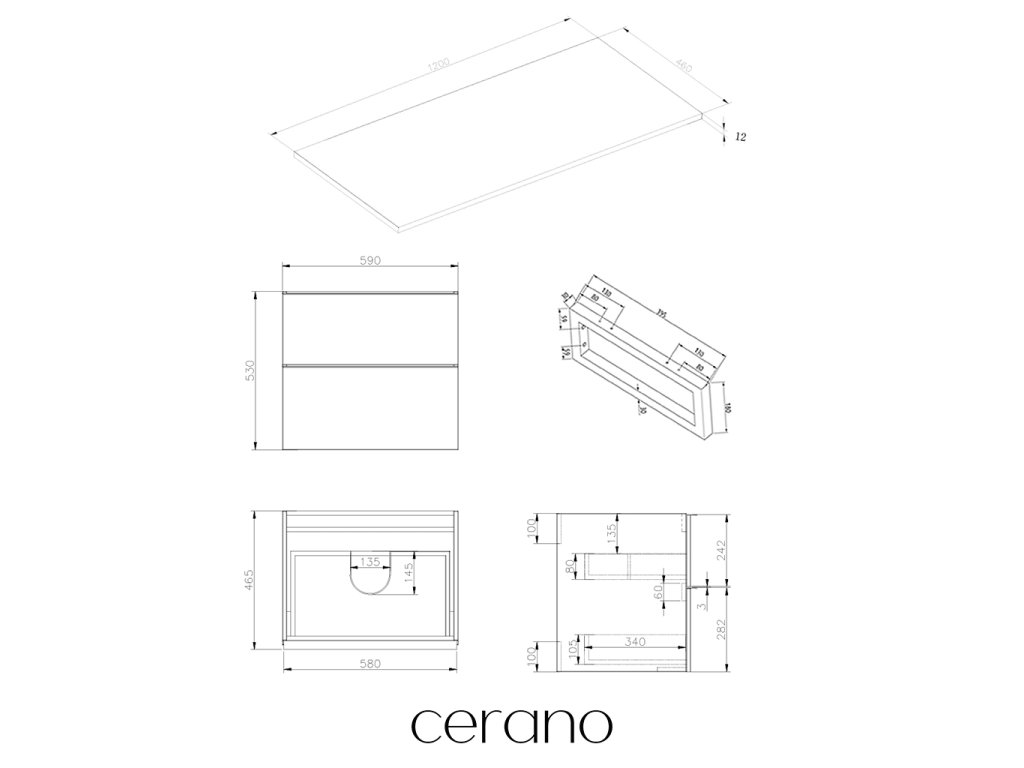 CERANO - Blat umywalkowy z lanego marmuru Elanys - 120x46,5x1,2 cm - Szafka Velora 59 cm - matowa czerń, uchwyt czarny - konsola chromowana
