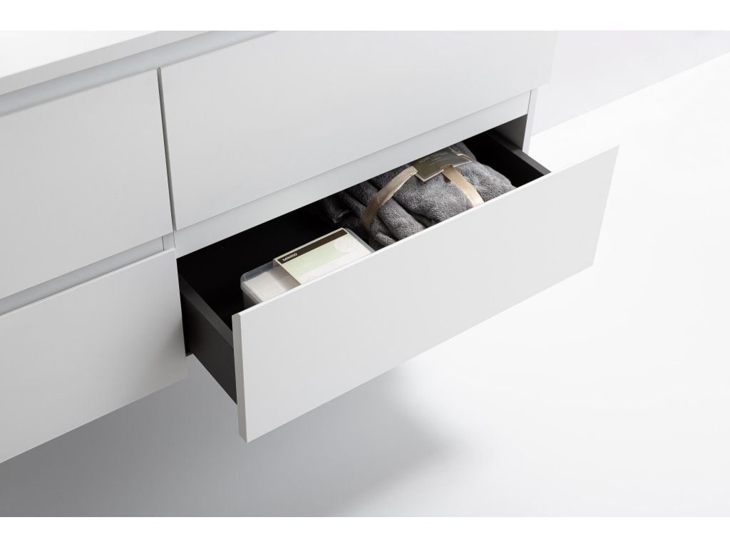 Szafka przeznaczona jest do montażu na ścianie i wyposażona w regulowane okucia, znajdujące się na korpusie szafki pod górnym fryzem, umożliwiające regulację wysokości i płaszczyzny. W szufladzie znajduje się zakryte wycięcie do montażu syfonu umywalkowego.