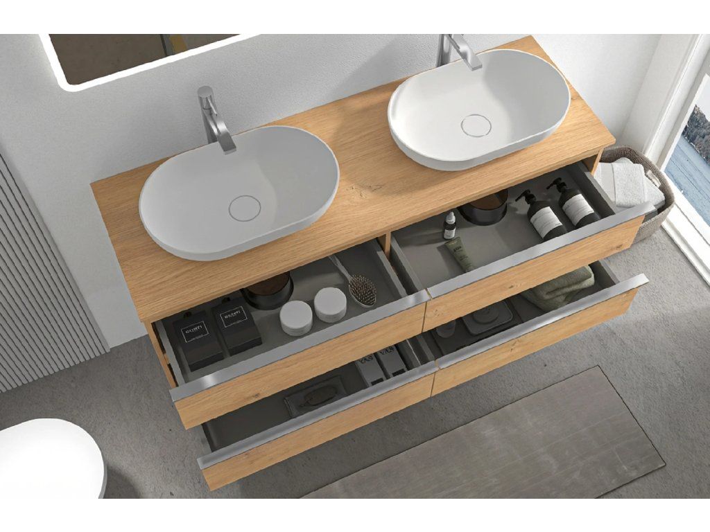 CERANO - Szafka łazienkowa Velora - dąb miodowy, uchwyt chromowany + blat umywalkowy Navira Slim - 18 mm - 140x54,8x46,5 cm