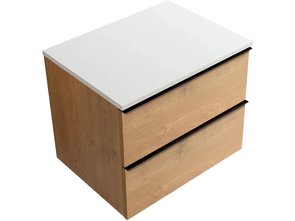 CERANO - Szafka łazienkowa Velora - dąb miodowy, uchwyt czarny + blat marmurowy podświetlany Elanys - 12 mm - biały mat - 70x54,2x46,5 cm
