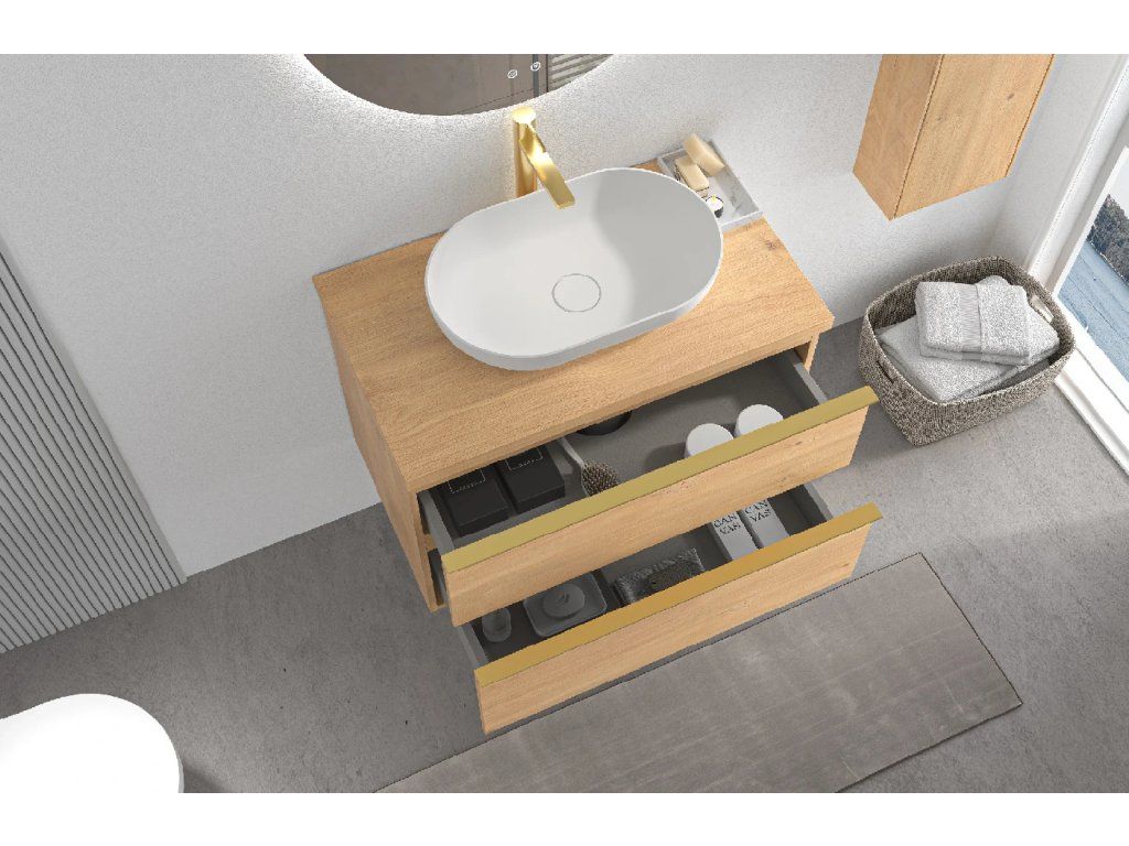 CERANO - Szafka łazienkowa Velora - dąb miodowy, uchwyt złoty + blat umywalkowy Navira Pro - 36 mm - 100x56,6x46,5 cm