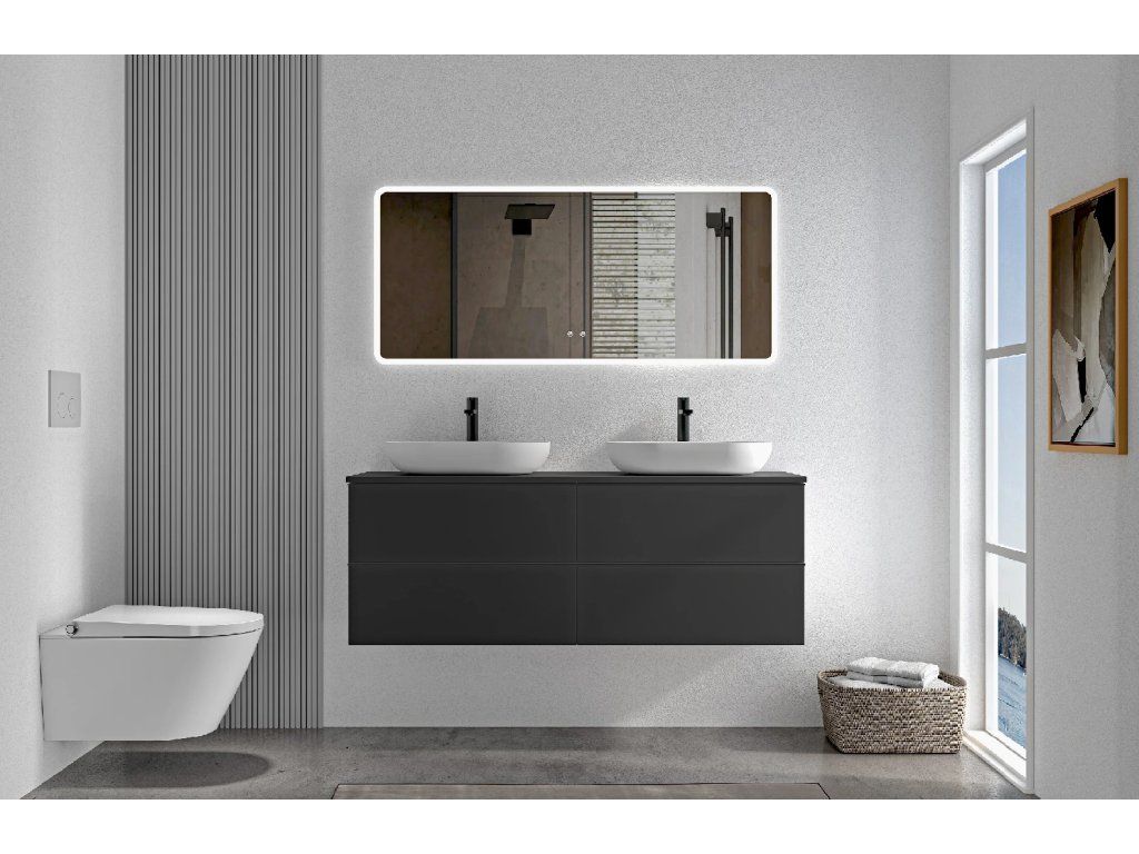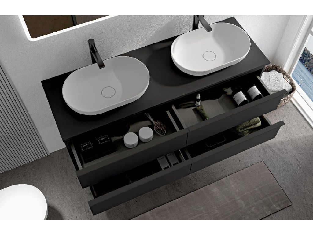 CERANO - Szafka łazienkowa Velora - matowa czerń, czarny uchwyt + blat umywalkowy Navira Slim - 18 mm - 140x54,8x46,5 cm