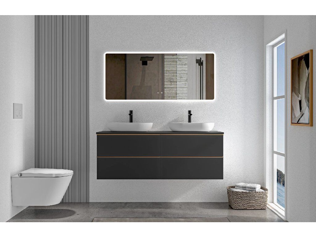 CERANO - Szafka łazienkowa Velora - matowa czerń, złoty uchwyt + blat umywalkowy Navira Slim - 18 mm - 160x54,8x46,5 cm