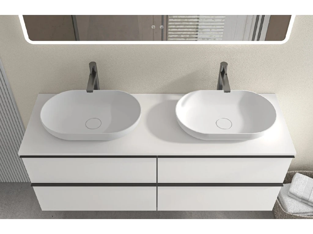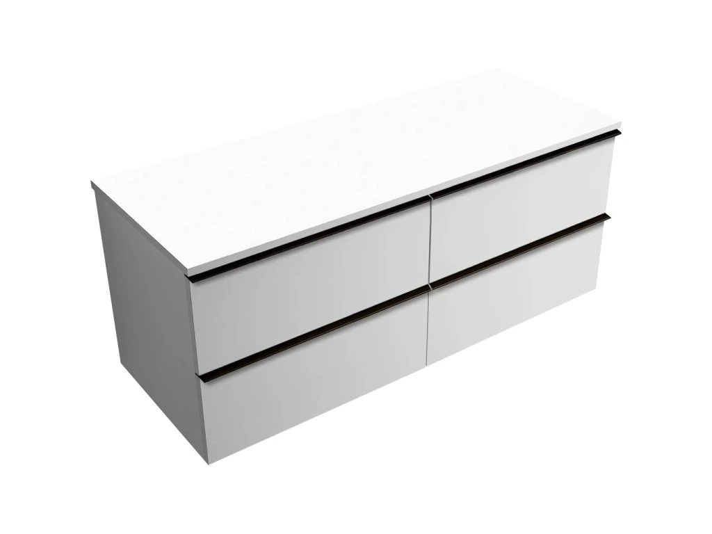 CERANO - Szafka łazienkowa Velora z uchwytem/blatem z odlewanego marmuru Elanys - 12 mm - matowa biel, czarny uchwyt - 138x53x45,2 cm