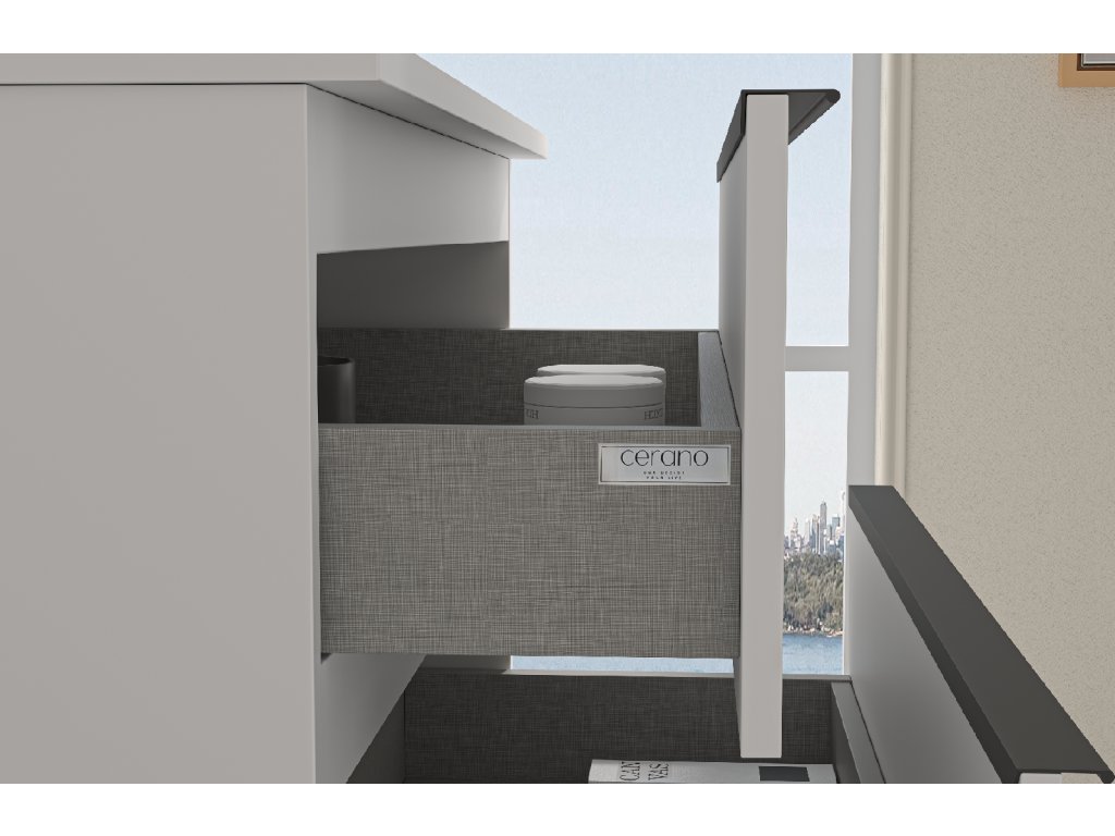 Szuflada wyposażona jest w mechanizm cichego domykania, który łączy w sobie amortyzator i system sprężynowy, zapewniając kontrolowane zamykanie. Podczas zamykania ruch automatycznie zwalnia, a szuflada cicho domyka się do pozycji końcowej. Mechanizm ten zapobiega uderzeniom, wydłuża żywotność szuflady i zapewnia większy komfort użytkowania.