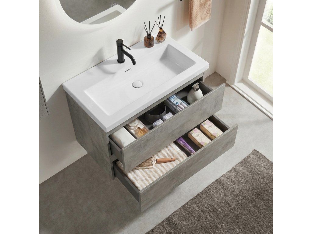 CERANO - Szafka łazienkowa Carole - betonowo-szary + umywalka Ovo z odlewanego marmuru - połyskująca biel - 70,5x53x46,3 cm