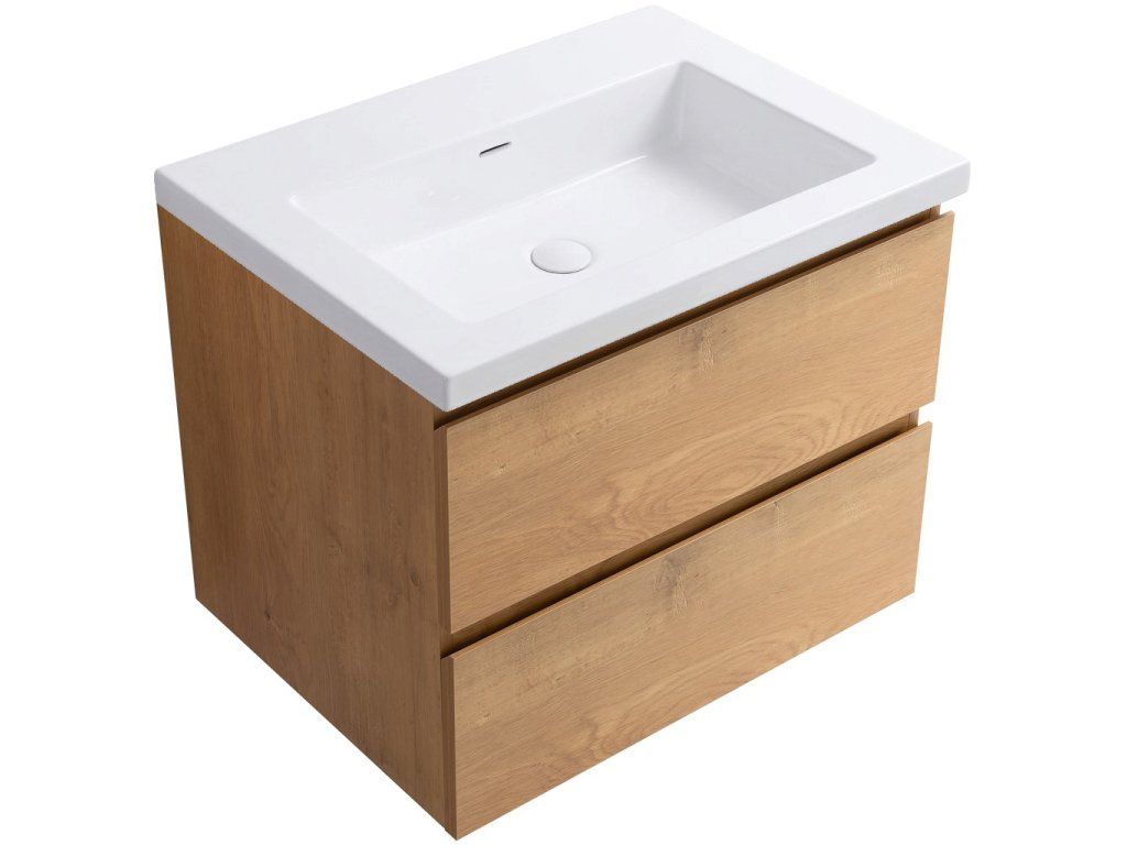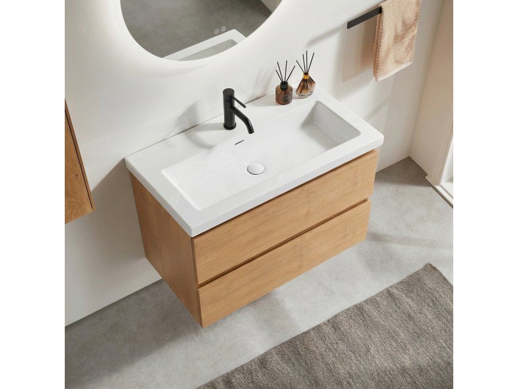 CERANO - Szafka łazienkowa Carole - dąb miodowy + umywalka marmurowa Ovo podświetlana - połysk biały - 70,5x53x46,3 cm