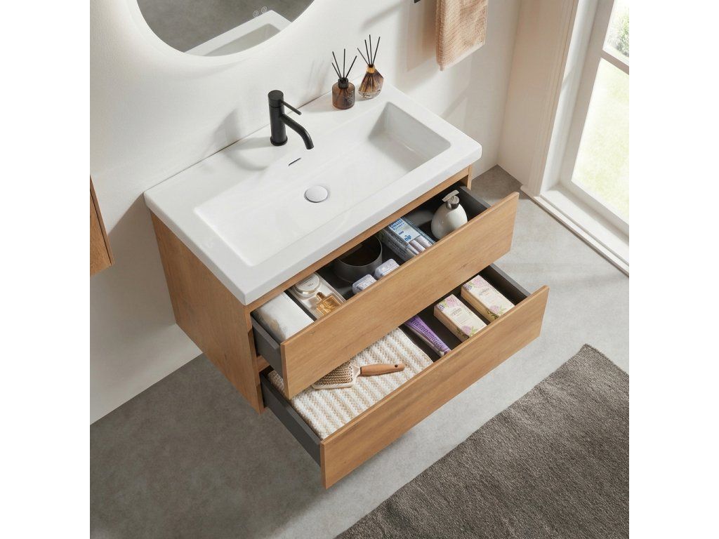 Szafka łazienkowa jest dostarczana w pełni zmontowana w fabryce – nie wymaga montażu, wystarczy rozpakować i powiesić. Profesjonalny montaż gwarantuje idealne dopasowanie, zwiększoną wytrzymałość i natychmiastową gotowość do użycia. Oszczędzasz czas i otrzymujesz niezawodne meble bez konieczności montażu.