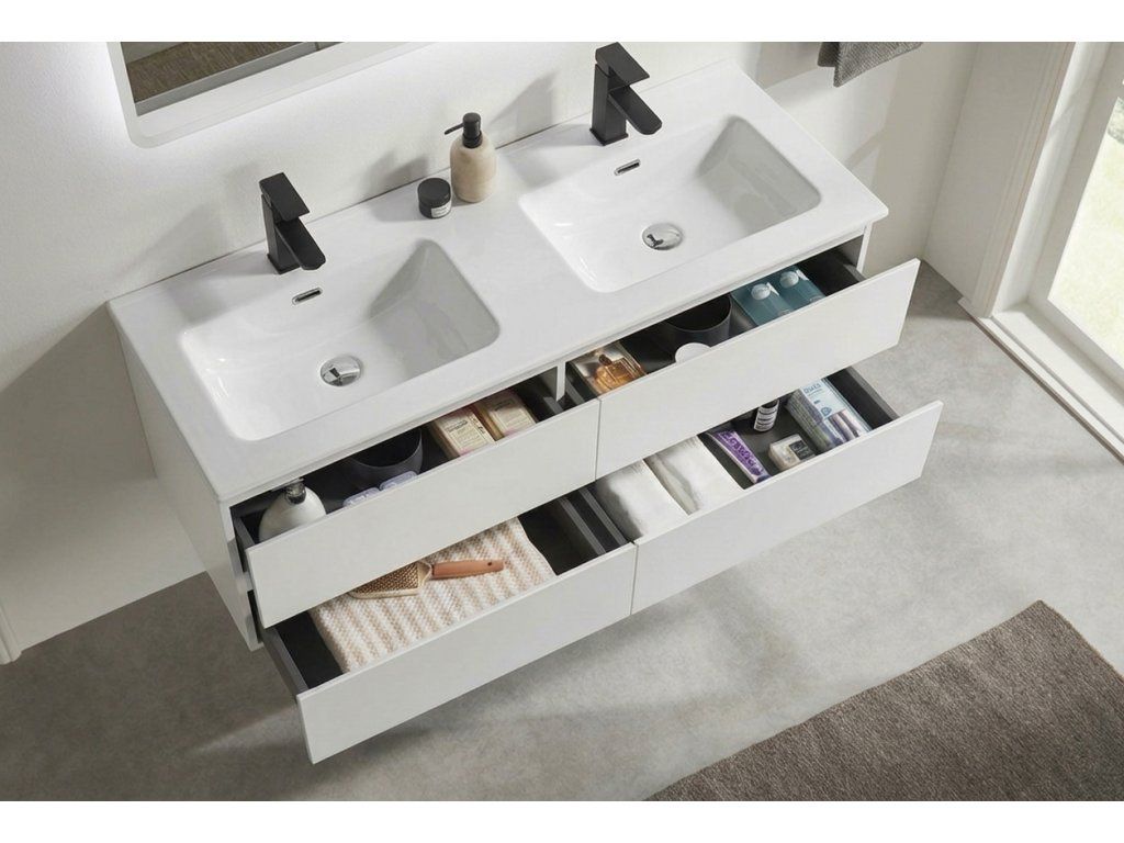 CERANO - Szafka łazienkowa Carole - matowa biel + Podwójna ceramiczna umywalka Novo - połyskliwa biel - 121x49,5x46,5 cm