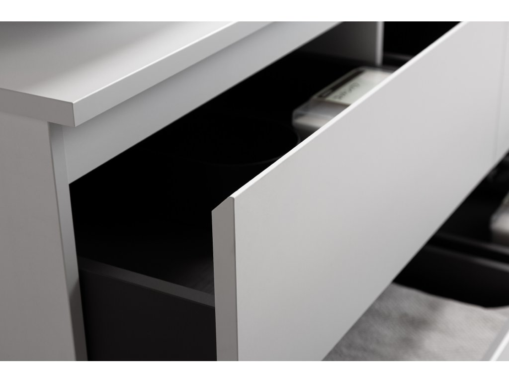 Szuflada wyposażona jest w mechanizm cichego domykania, który łączy w sobie amortyzator i system sprężynowy, zapewniając kontrolowane zamykanie. Podczas zamykania ruch automatycznie zwalnia, a szuflada cicho domyka się do pozycji końcowej. Mechanizm ten zapobiega uderzeniom, wydłuża żywotność szuflady i zapewnia większy komfort użytkowania.