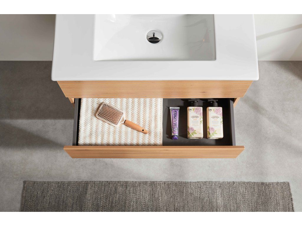 Szafka przeznaczona jest do montażu na ścianie i wyposażona w regulowane okucia, znajdujące się na korpusie szafki pod górnym fryzem, umożliwiające regulację wysokości i płaszczyzny. W szufladzie znajduje się zakryte wycięcie do montażu syfonu umywalkowego.