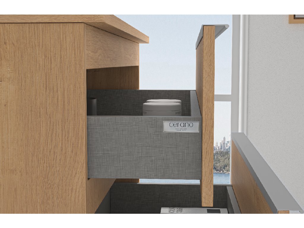 Szuflada wyposażona jest w mechanizm cichego domykania, który łączy w sobie amortyzator i system sprężynowy, zapewniając kontrolowane zamykanie. Podczas zamykania ruch automatycznie zwalnia, a szuflada cicho domyka się do pozycji końcowej. Mechanizm ten zapobiega uderzeniom, wydłuża żywotność szuflady i zapewnia większy komfort użytkowania.