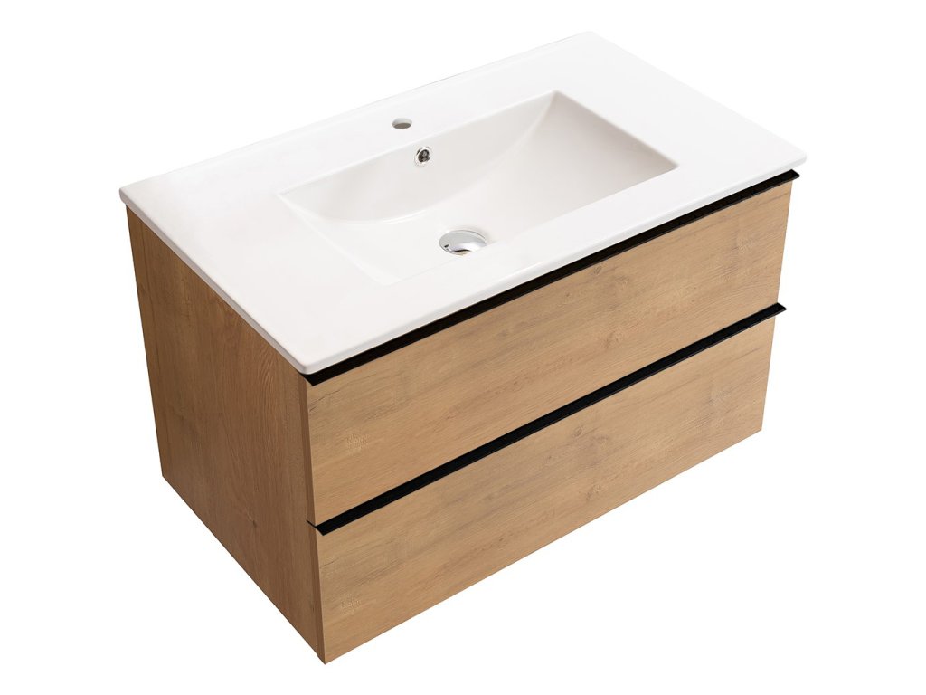 CERANO - Szafka łazienkowa pod umywalkę z uchwytem Velora + umywalka ceramiczna Todo - dąb miodowy, uchwyt czarny - 79x53x46 cm