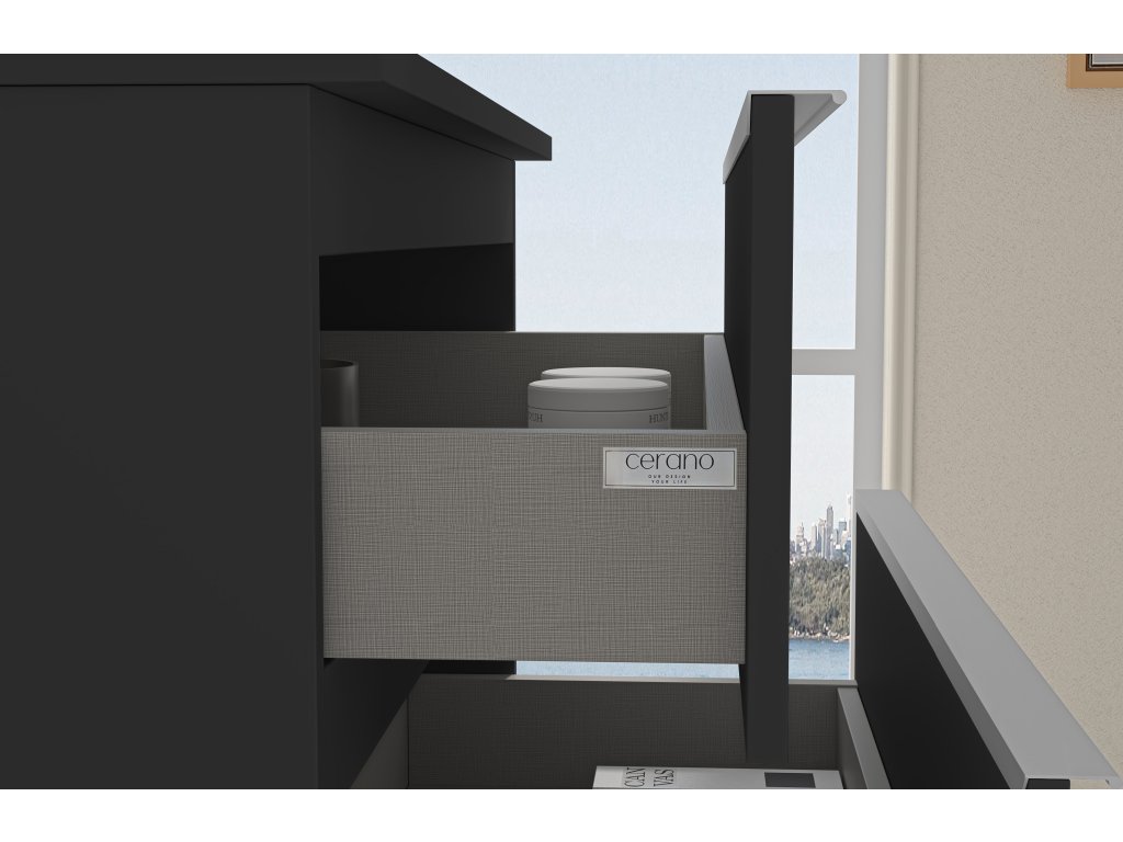 Szuflada wyposażona jest w mechanizm cichego domykania, który łączy w sobie amortyzator i system sprężynowy, zapewniając kontrolowane zamykanie. Podczas zamykania ruch automatycznie zwalnia, a szuflada cicho domyka się do pozycji końcowej. Mechanizm ten zapobiega uderzeniom, wydłuża żywotność szuflady i zapewnia większy komfort użytkowania.