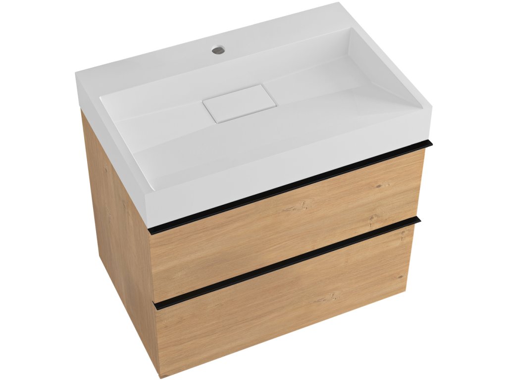 CERANO - Szafka łazienkowa Velora - dąb miodowy - uchwyt czarny + umywalka z otworem na baterię z lanego marmuru Vita - połysk biały - 70x53x46 cm