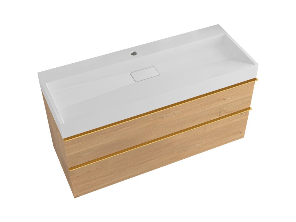 CERANO - Szafka łazienkowa Velora - dąb miodowy - uchwyt złoty + umywalka z otworem na baterię z lanego marmuru Vita - połysk biały - 100x53x46 cm