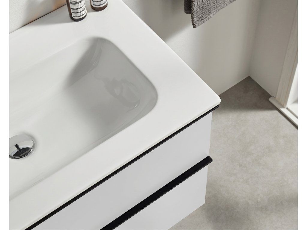 Szafka przeznaczona jest do montażu na ścianie i wyposażona w regulowane okucia, znajdujące się na korpusie szafki pod górnym fryzem, umożliwiające regulację wysokości i płaszczyzny. W szufladzie znajduje się zakryte wycięcie do montażu syfonu umywalkowego.