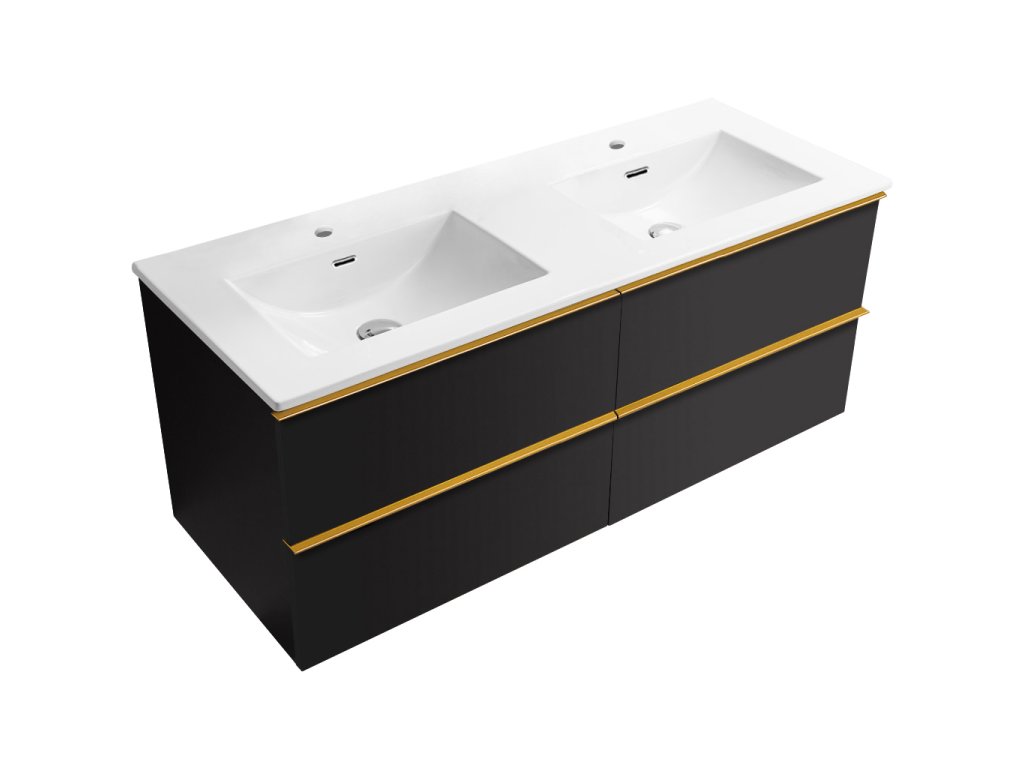 CERANO - Szafka łazienkowa Velora - matowa czerń - złoty uchwyt + umywalka ceramiczna Novo - połysk biały - 119x53x45,2 cm