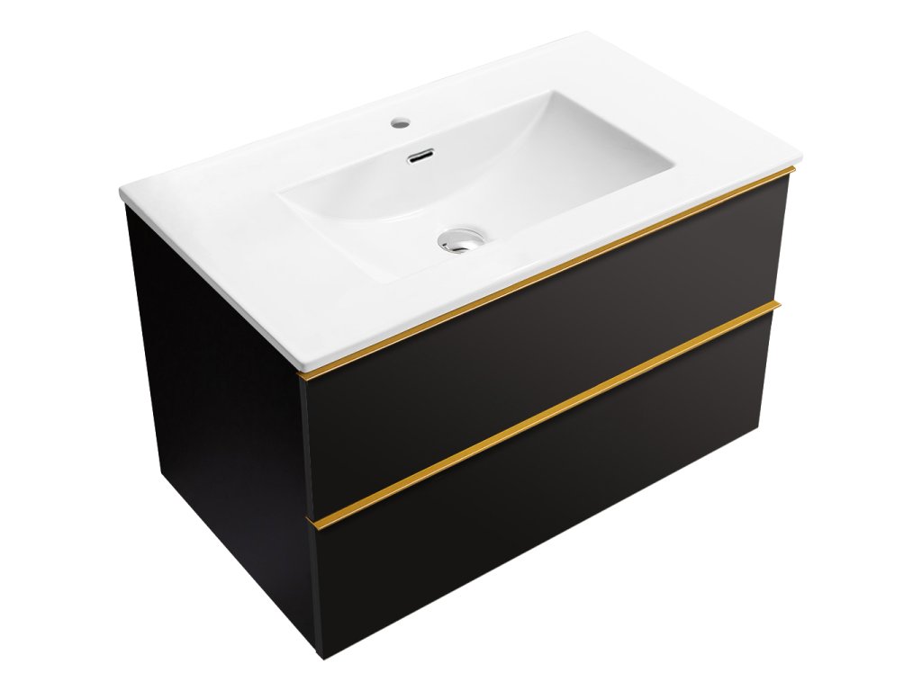 CERANO - Szafka łazienkowa Velora - matowa czerń - złoty uchwyt + umywalka ceramiczna Novo - połysk biały - 79x53x46 cm