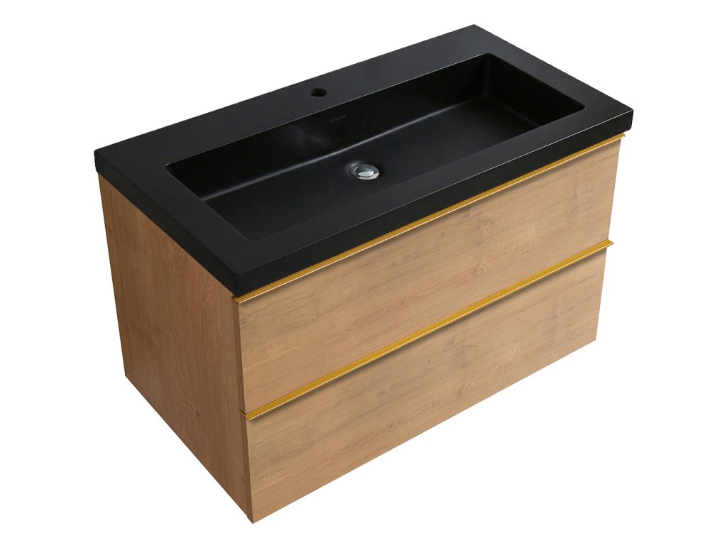CERANO - Szafka łazienkowa Velora - matowa czerń - złoty uchwyt + Umywalka ceramiczna Ovo - dąb miodowy - 79x53x46 cm