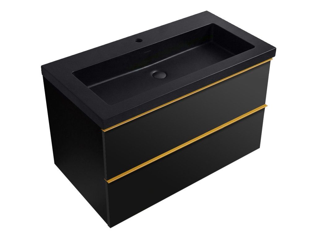 CERANO - Szafka łazienkowa Velora - matowa czerń - złoty uchwyt + Umywalka marmurowa Ovo podświetlana - matowa czerń - 79x53x46 cm