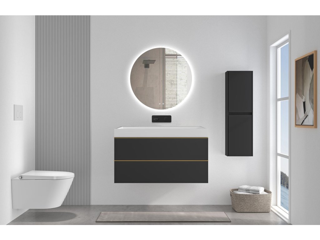 CERANO - Szafka łazienkowa Velora - matowa czerń - złoty uchwyt + umywalka z lanego marmuru Vita - matowa biel - 100x53x46 cm