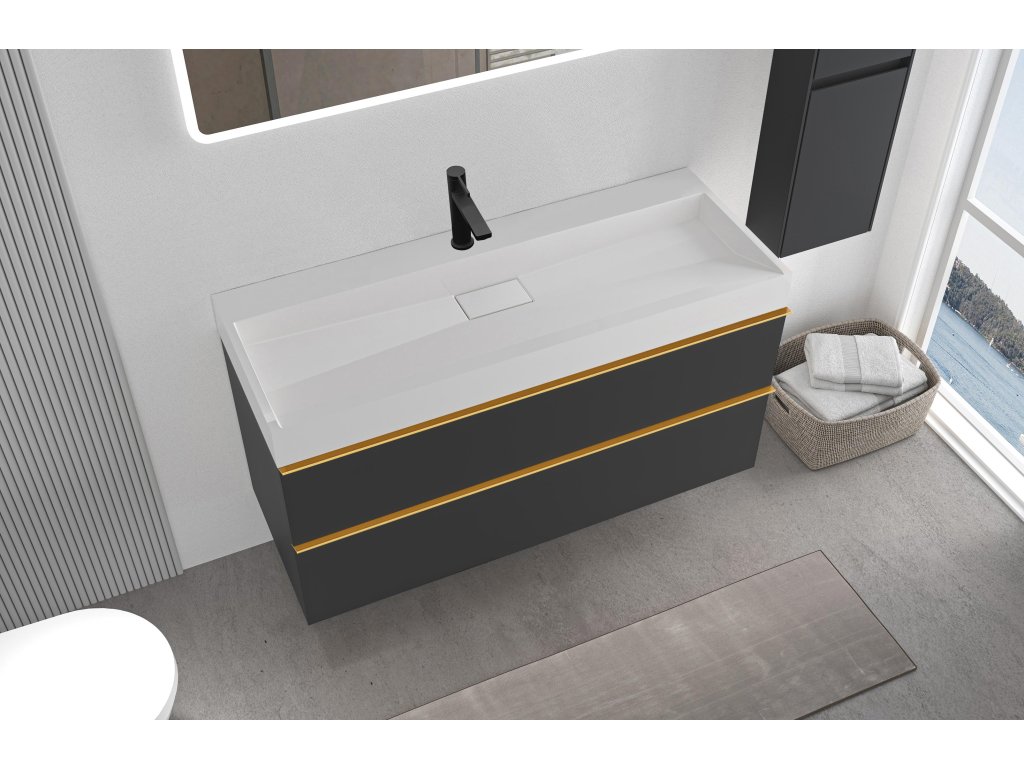 CERANO - Szafka łazienkowa Velora - matowa czerń - złoty uchwyt + umywalka z otworem na baterię z lanego marmuru Vita - matowa biel - 100x53x46 cm