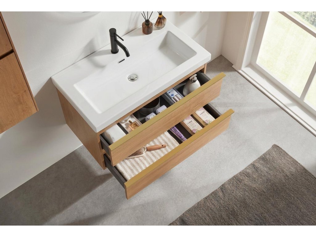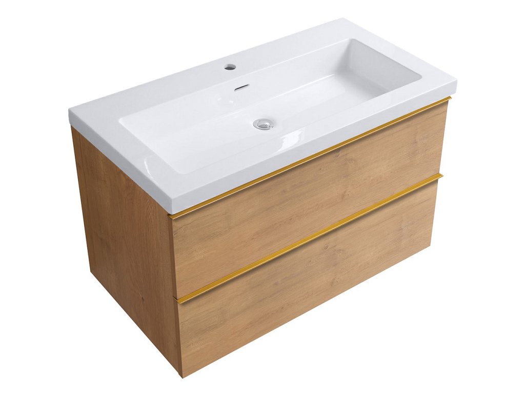 CERANO - Szafka łazienkowa Velora - połysk biały - uchwyt złoty + Umywalka ceramiczna Ovo - dąb miodowy - 99x53x46 cm