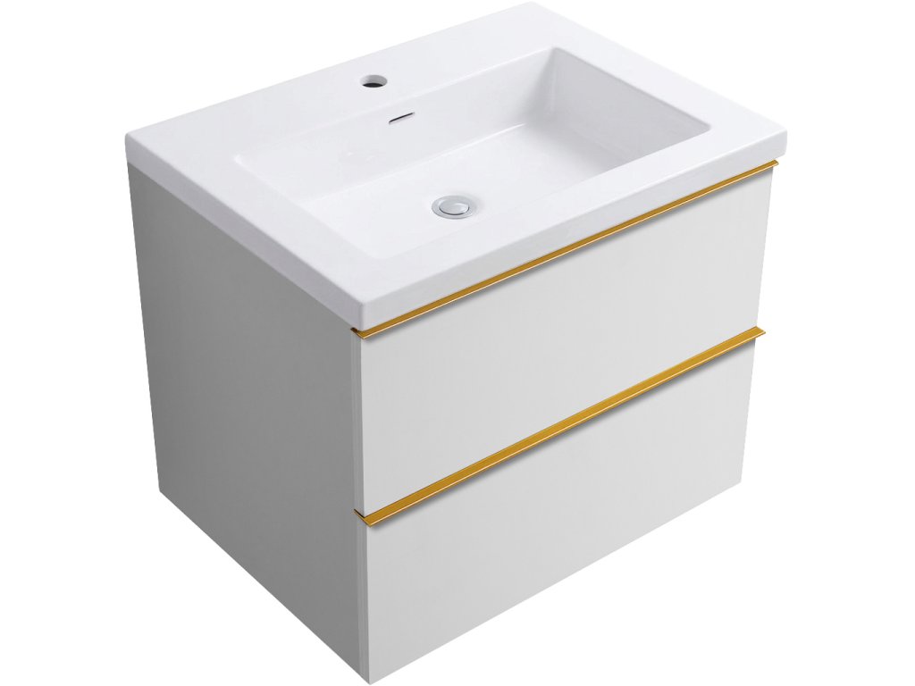 CERANO - Szafka łazienkowa Velora - połysk biały - uchwyt złoty + Umywalka ceramiczna Ovo - matowa biel - 69x53x46 cm