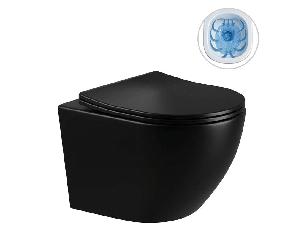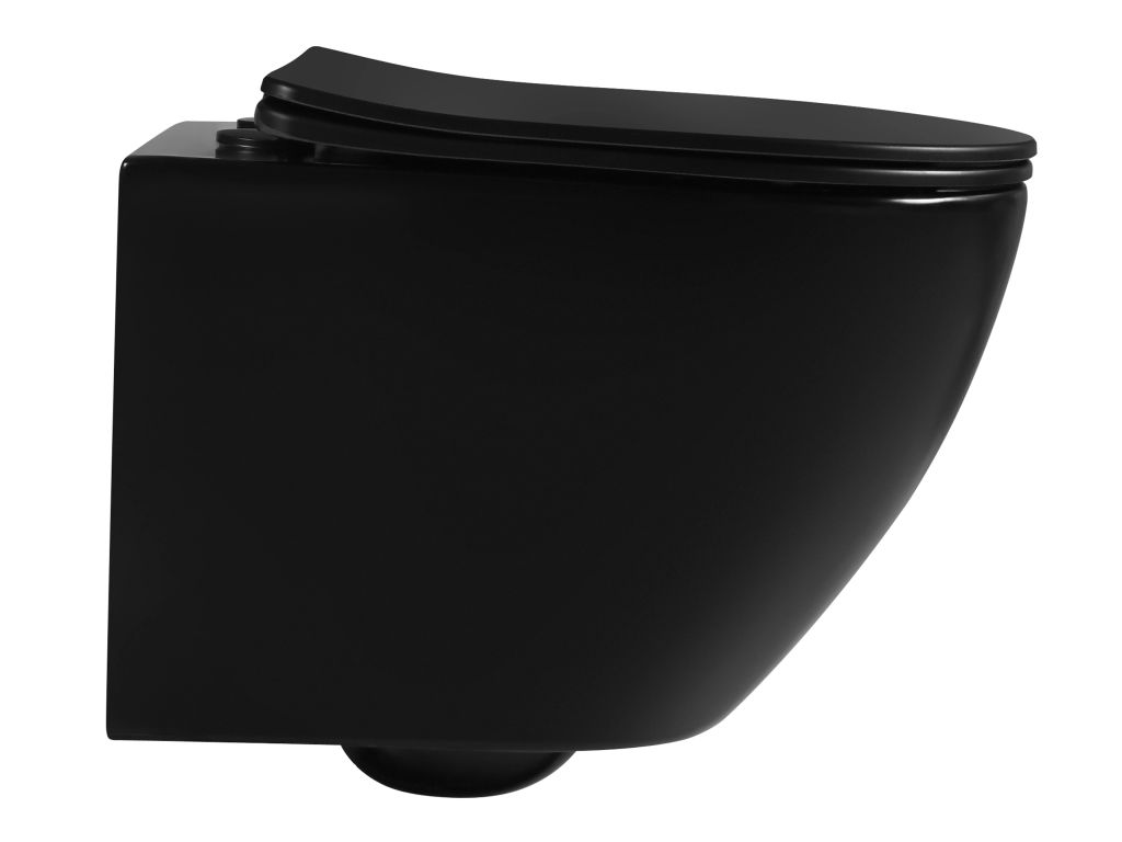 CERANO - podwieszana toaleta Verde, bezkołnierzowa + deska Slim/UF - połysk czarny - 49x36 cm