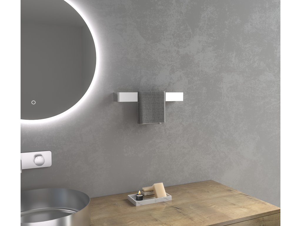 Przód z długim ramieniem do umieszczania ręczników. Ramię to jest mocno przymocowane do ściany za pomocą dwóch małych śrub montażowych z kołkami, które są dyskretnie umieszczone na końcu krótszego ramienia. Ta metoda montażu zapewnia większą wytrzymałość i nośność całego uchwytu. Zestaw montażowy jest dołączony do opakowania.