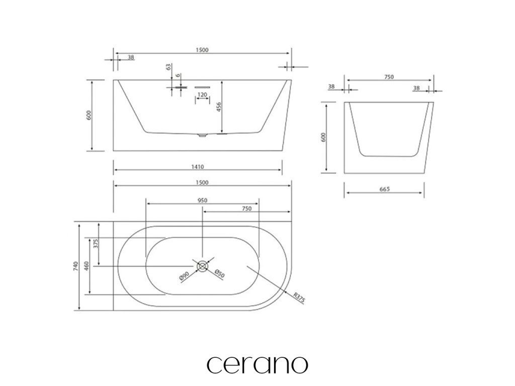 CERANO - Wanna akrylowa wolnostojąca Bianco, lewa - czarny mat/biały połysk - 150x74 cm