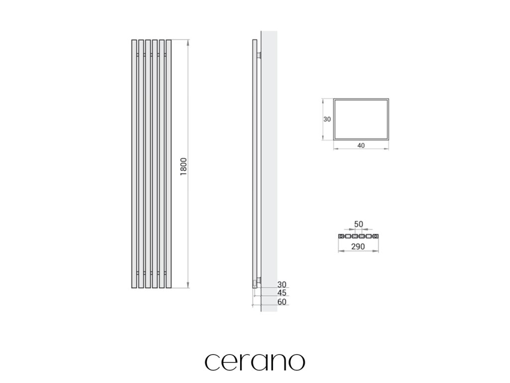 CERANO - Zestaw grzejnikowy łazienkowy Pyricus - ogrzewanie kombinowane, listwa WiFi - podłączenie centralne 50 mm - 721W - matowy czarny - 1800x290 mm