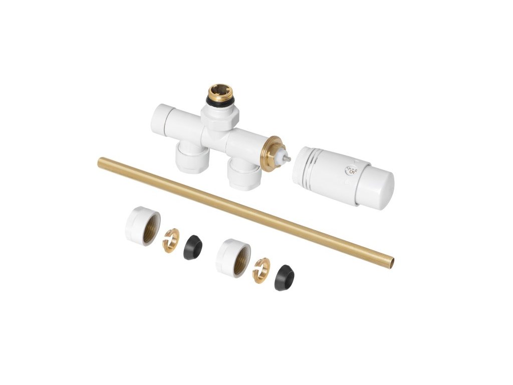 To zestaw dolnego podłączenia grzejnika, który zawiera elementy kątowe lewe/prawe oraz elementy proste lewe/prawe. Zestaw umożliwia również zastosowanie grzałki elektrycznej w konfiguracji grzejnikowej.
