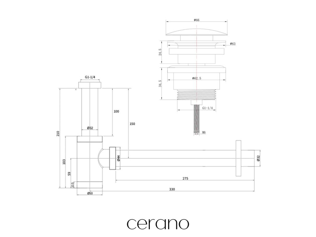 CERANO - Syfon umywalkowy - 5/4" - mosiądz - DN32 mm - z odpływem klik-klak - bez przelewu - biały